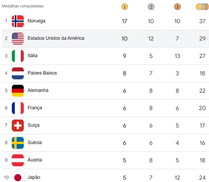 Nas medalhas, a Noruega atingiu 17 de ouro e bateu o recorde dos Jogos Olímpicos de Inverno.