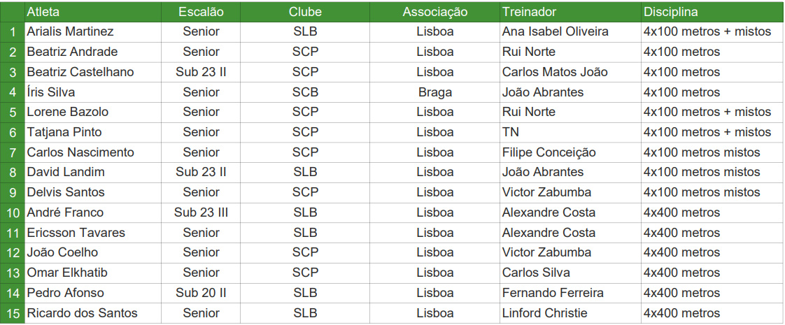 A Federação Portuguesa de Atletismo convocou os seguintes atletas para o Campeonato do Mundo de Estafetas, que decorrerá em Gaborone (Botsuana), nos dias 2 e 3 de maio: